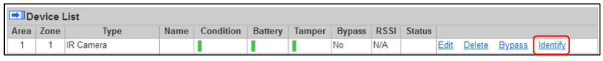 * Når panelet modtager testsignalet, vil det bippe én gang og vise PIR-kameraets information øverst på enhedslisten.