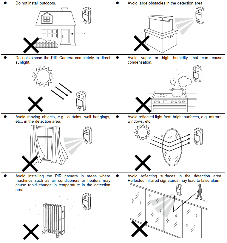 Hvis dit PIR-kamera er installeret et sted, hvor kameraets synsfelt er et komplekst miljø med kraftigt lys eller mange farver, vil de optagede billeder få stor filstørrelse, hvilket muligvis kan føre til afkortning ved overførsel af billederne til kontrolpanelet.