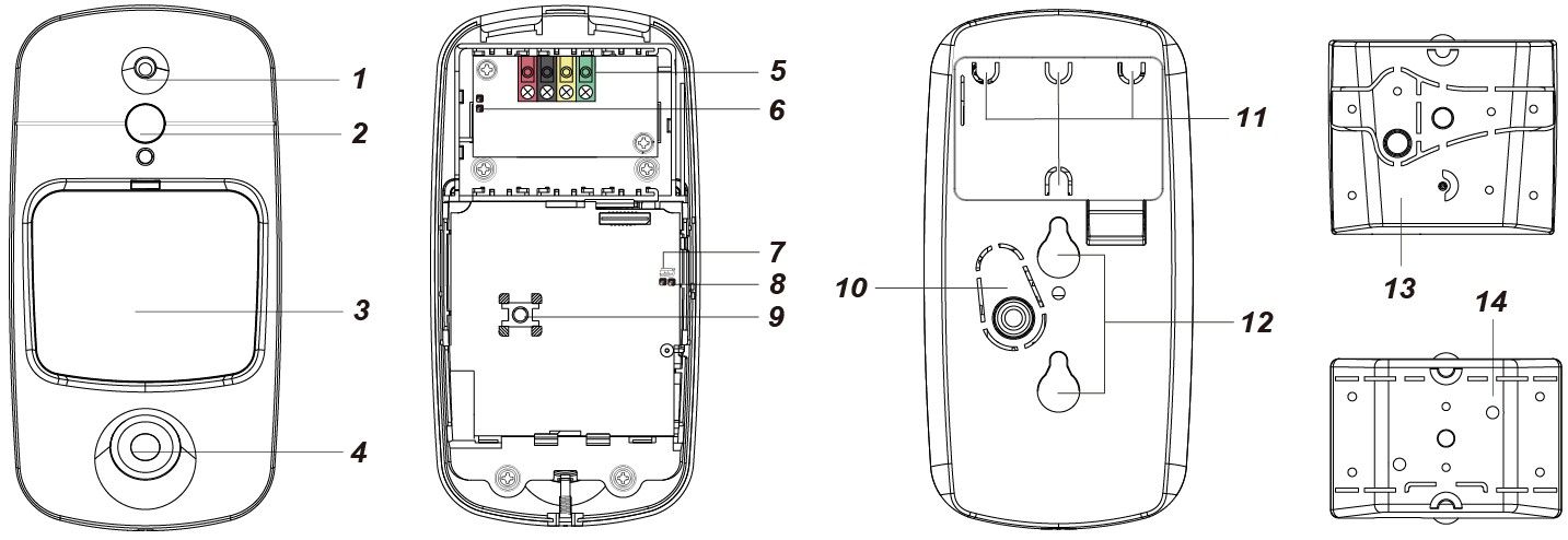 PIR-kameraet er beskyttet af en tamperkontakt, som er nedtrykt, når PIR-kameraet er korrekt installeret. Når PIR-kameraet fjernes fra monteringsfladen eller dets dæksel åbnes, aktiveres tamperkontakten, og PIR-kameraet sender et tamper-åbent signal til panelet for at minde brugeren om situationen.