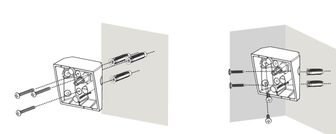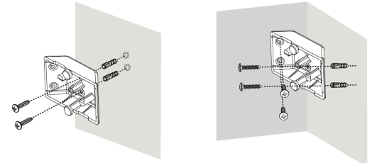 1. Brug de tre overfladeskruehuller som skabelon og bor monteringshuller. Til hjørnemontering skal du bruge de fire hjørneskruehuller som skabelon.