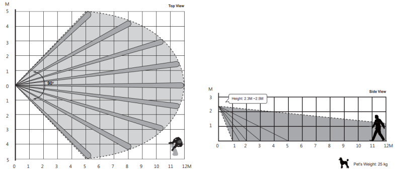 PIR-kameraet er designet med en detektionsafstand på 9 meter, når det er monteret i en højde på 2,3-2,5 meter over jorden. Når kæledyrsimmunitetsfunktionen er aktiveret, og enheden er monteret med den valgfrie monteringsbeslag B, vil bevægelsessensor-kameraet ikke registrere kæledyr op til 25 kg, når det er monteret i samme højde.