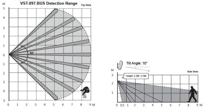 VST-897-BUS er et passivt infrarødt (PIR) bevægelsessensorkamera. Det er i stand til at sende kablede signaler og optagede billeder (billedkvalitet op til 1280 x 720 pixels) over BUS til kontrolpanelet ved bevægelsesdetektion.