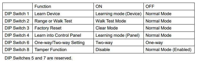 Stel DIP-schakelaar 6 in voor eenrichtings-/tweerichtingsapparaat wanneer de repeater is uitgeschakeld. Nadat de instelling is voltooid, schakel de repeater in en leer/leer deze opnieuw in het paneel zodat de instelling van kracht wordt.