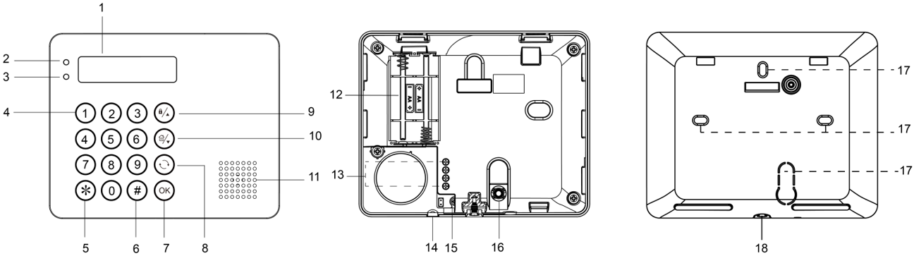 Το ενσύρματο/ασύρματο πληκτρολόγιο μπορεί είτε να τοποθετηθεί σε επίπεδη επιφάνεια είτε σε τοίχο με βίδες. Διαθέτει επίσης διακόπτη προστασίας κατά της παραβίασης που ενεργοποιείται σε κάθε μη εξουσιοδοτημένη προσπάθεια ανοίγματος του πίσω καλύμματος.