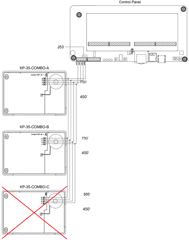 * Στην εικόνα παρακάτω, το KP-35-COMBO-**A** και το KP-35-COMBO-**B** είναι σωστά ενσύρματα εν σειρά καθώς η συνολική απόσταση καλωδίου των δύο πληκτρολογίων από τον Πίνακα Ελέγχου είναι εντός 1500ft. Για το KP-35-COMBO-**C** στην εικόνα παρακάτω, είναι **ΚΑΝΕΤΕ** σωστά συνδεδεμένο καθώς είναι μακρύτερα από 1000 πόδια από τον Πίνακα Ελέγχου.