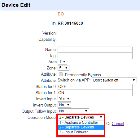 Etter at modusen «Input Follower» er valgt, vil funksjonen Home Automation Rule & Apply Scene på ***SmartHomeSec*** Server bli deaktivert. Du må programmere **Output Follow Input** innstillingen på DO Device Edit-siden, slik at enheten på utgangsterminalen vil bli aktivert i samsvar med utløseren fra inngangsterminalen.