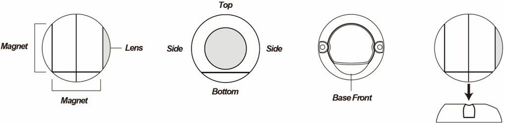 * Funkcja wykrywania ruchu PIR jest kierunkowa. Jest bardziej czuła na ruchy boczne, a mniej czuła na ruchy pionowe z góry na dół. Użyj położenia dolnego magnesu jako odniesienia do określenia kierunku poziomego i pionowego PIR.