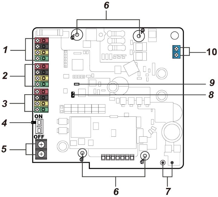 1. Terminale de conectare BUS către **Panoul hibrid**l (4 fire: <mark style="color:roșu;">**V**</mark>, G, A, B) De asemenea, este important să se conecteze pozitivul panoului de control VESTA la VESTA-364N.