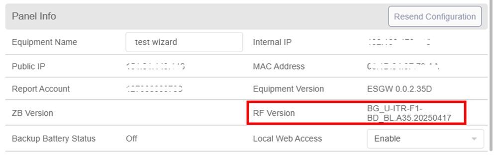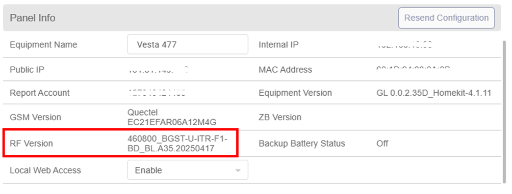 Inicie sesión como instalador usando la aplicación SmartHomeSec o el portal web y vaya a la configuración del panel de control. Desplácese hacia abajo para encontrar información sobre el panel de control y el firmware del módulo de radio RF.