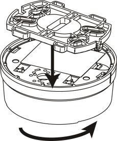 Paso 5 Ubique la marca de línea única en el detector y alinéela con uno de los ganchos del soporte. Coloque el detector de humo sobre los ganchos del soporte y luego gire el detector en sentido contrario a las agujas del reloj para bloquearlo en su lugar. La instalación ya está completa.