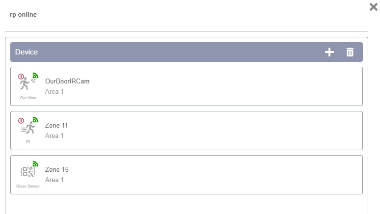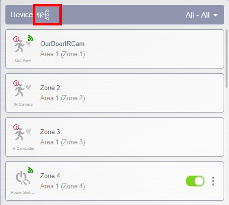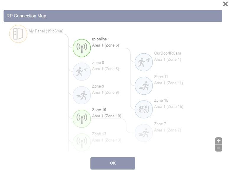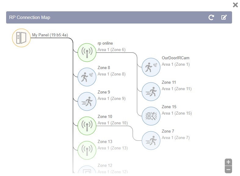 Den **Panelen**, den **Repeatern/RF-enheterna**, och **de RF-enheter som är anslutna till repeatern** kommer att visas från vänster kolumn till höger kolumn på kartan.