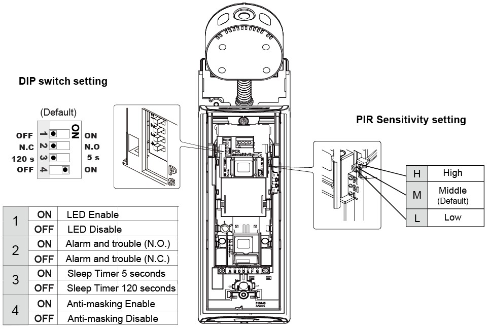 * When the PIR Camera is powered on, its PIR sensitivity, anti-masking, sleep timer and LED are determined by the DIP Switch settings. (Refer to **Dip Switch Settings** for details.) Users can change the settings either by adjusting DIP Switches or programming from the Panel remotely. Setting remotely from the Panel will overwrite DIP Switch settings.