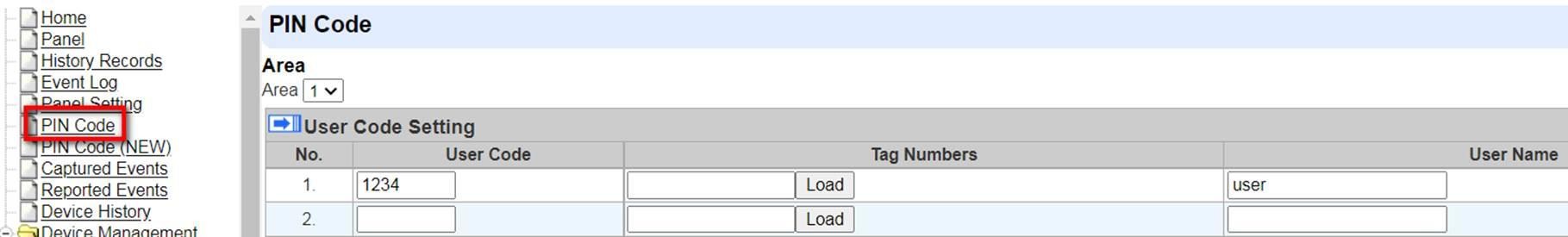 Step 1. Go to the PIN Code page on the Control Panel webpage, input a 4-digit or 6-digit user pin code and user name for the label, and assign the user pin code to an Area.