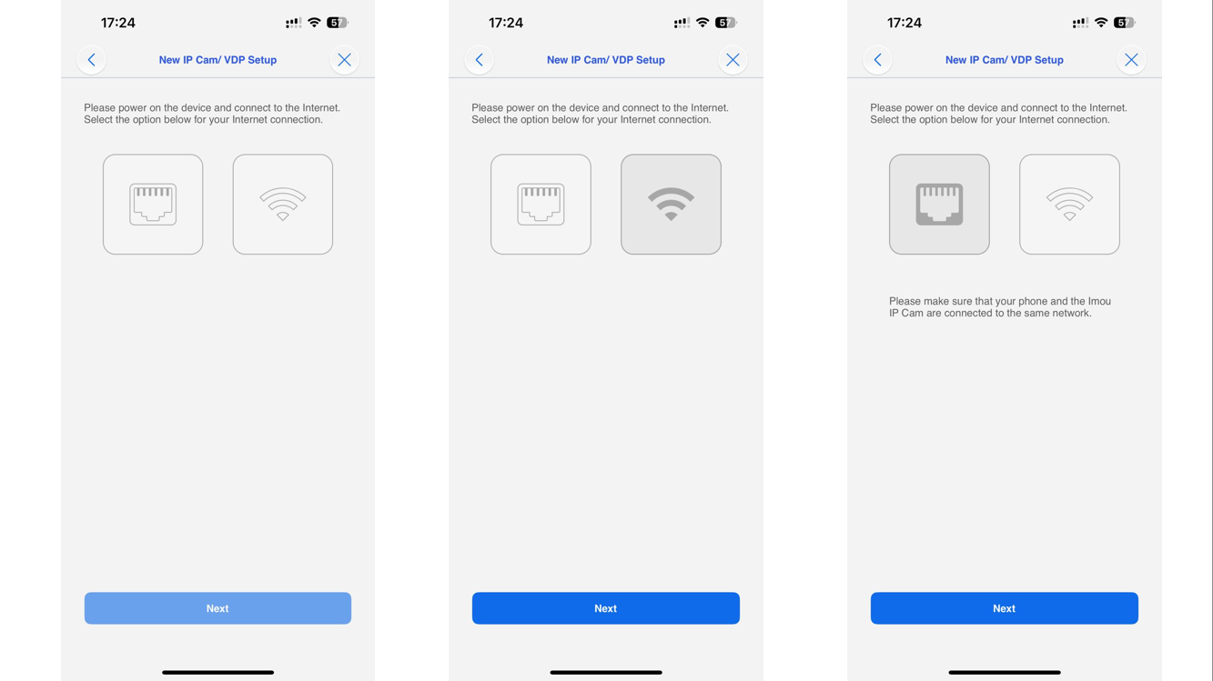 **If you're connecting your camera via Wi-Fi but it doesn't proceed to the IP search step, don't worry. This can happen if your mobile device temporarily lost internet connection while switching networks and didn’t reconnect properly.**